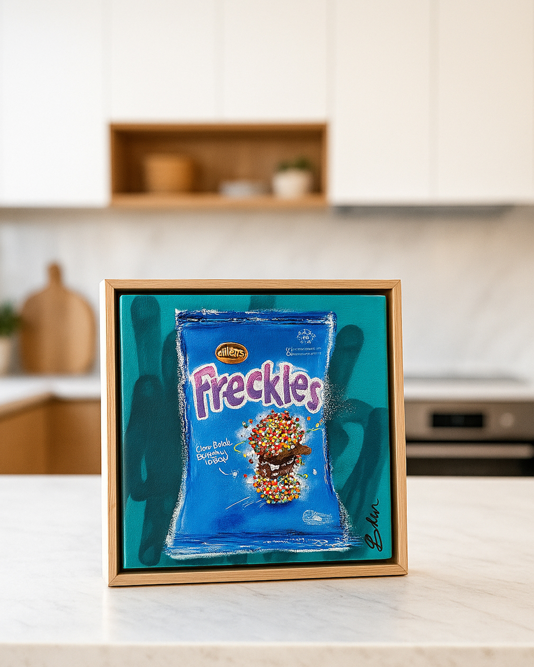 As with all works in the Baker Collection, this is original art for sale, one-of-a-kind and guaranteed to be exclusive. It is professionally framed and ready to hang, ensuring you enjoy a gallery-quality experience from the moment it arrives. The attention to detail, depth of colour, and expressive pop art style make ‘Freckles’ more than a painting—it’s a conversation starter, a joyful focal point, and a forever piece for your collection.