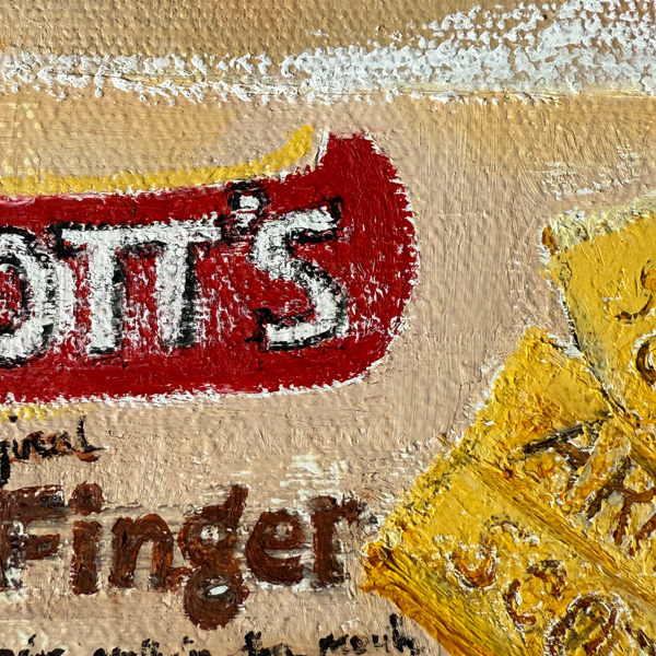When it comes to original art for sale, Nicki Baker-Comelli’s ‘Scotch Finger‘ is a standout piece that combines bold creativity and nostalgia. This vibrant pop art celebrates the iconic Scotch Finger biscuits, a treat kids and adults love. Nicki’s ability to transform everyday foods into extraordinary works of art is showcased brilliantly in this playful painting.