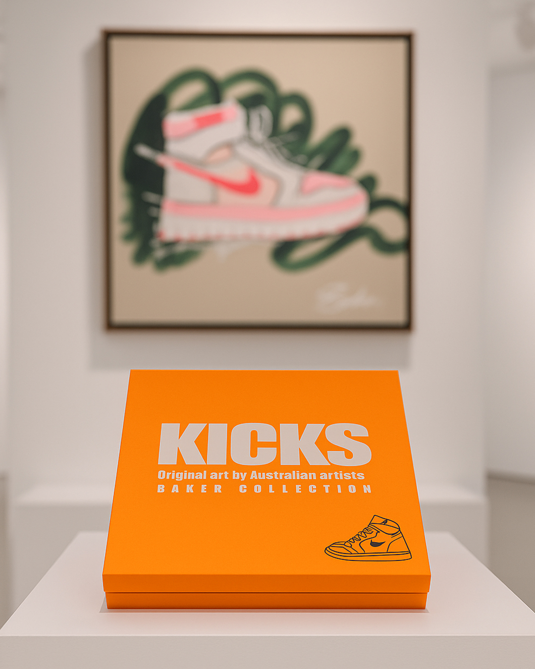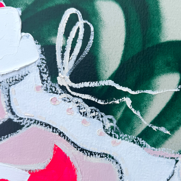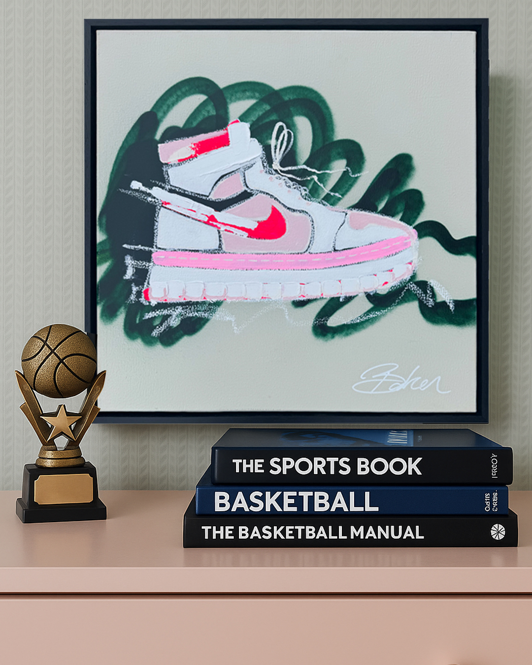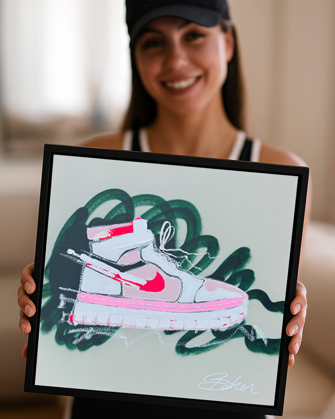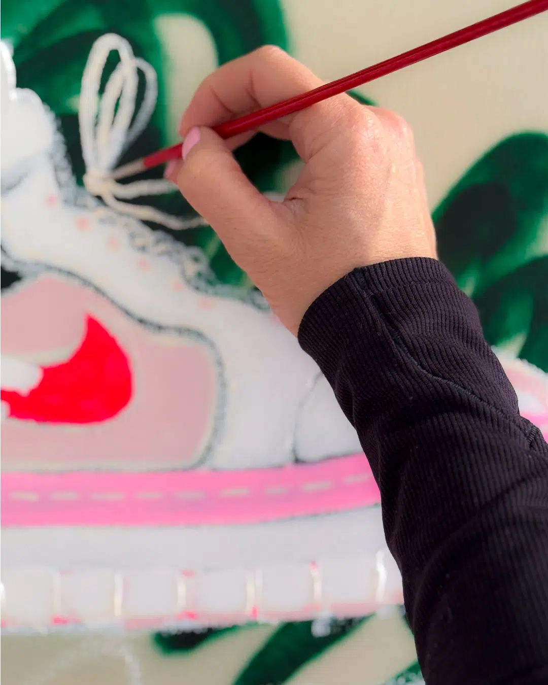 Australian artist Nicki Baker-Comelli bursts onto the scene with Nike art ‘Line Up’, a vibrant celebration of balance, rhythm, and fearless self-expression. She layers soft cream with vivid greens, warm pinks, and crisp whites—each brushstroke intentional, each colour alive with movement. This unique piece challenges you to stay focused, keep on track, and push forward.
