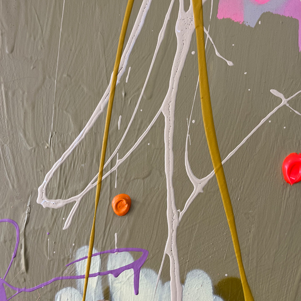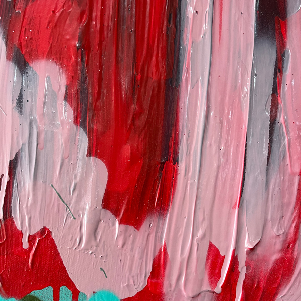 ‘Grafitti Flowers’ is one of her freshest series. This collection is big, bold and colourful. Like her other two collections, ‘Cartel Flowers’ and ‘Street Flowers’, the spray can graffiti style mark making and paintbrush work are combined. Jessica’s love for texture is less prevalent in this range. The fresh opaque titanium white layers worked into bolder colours capture this extensive collection.