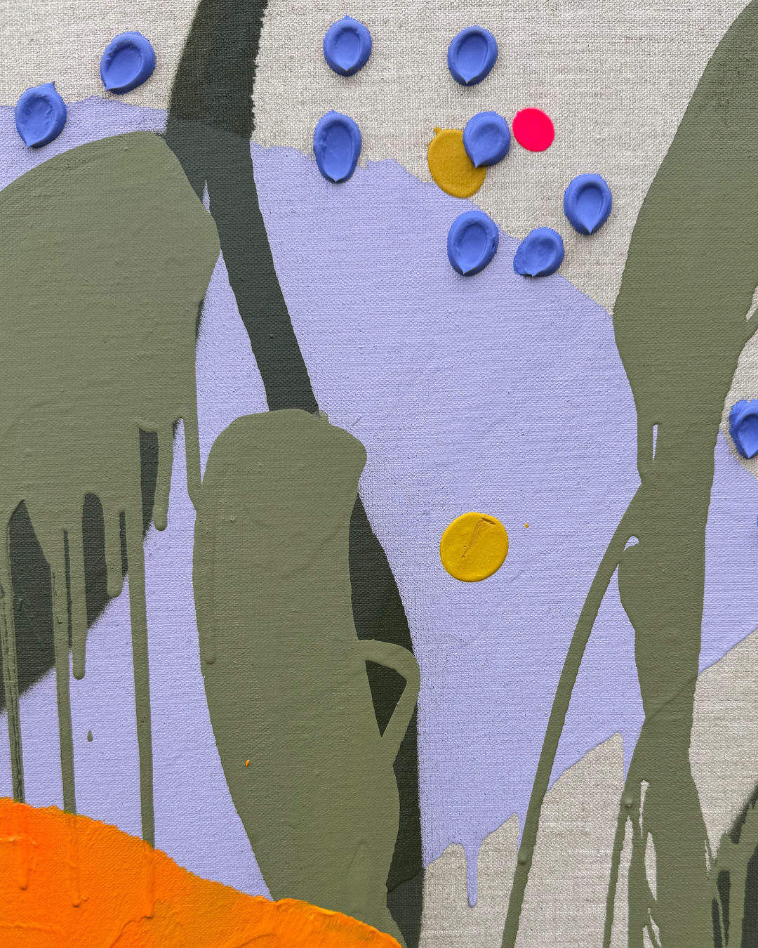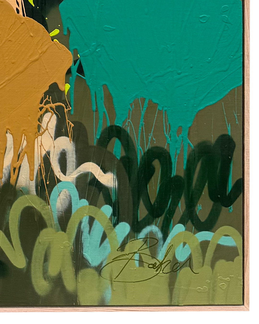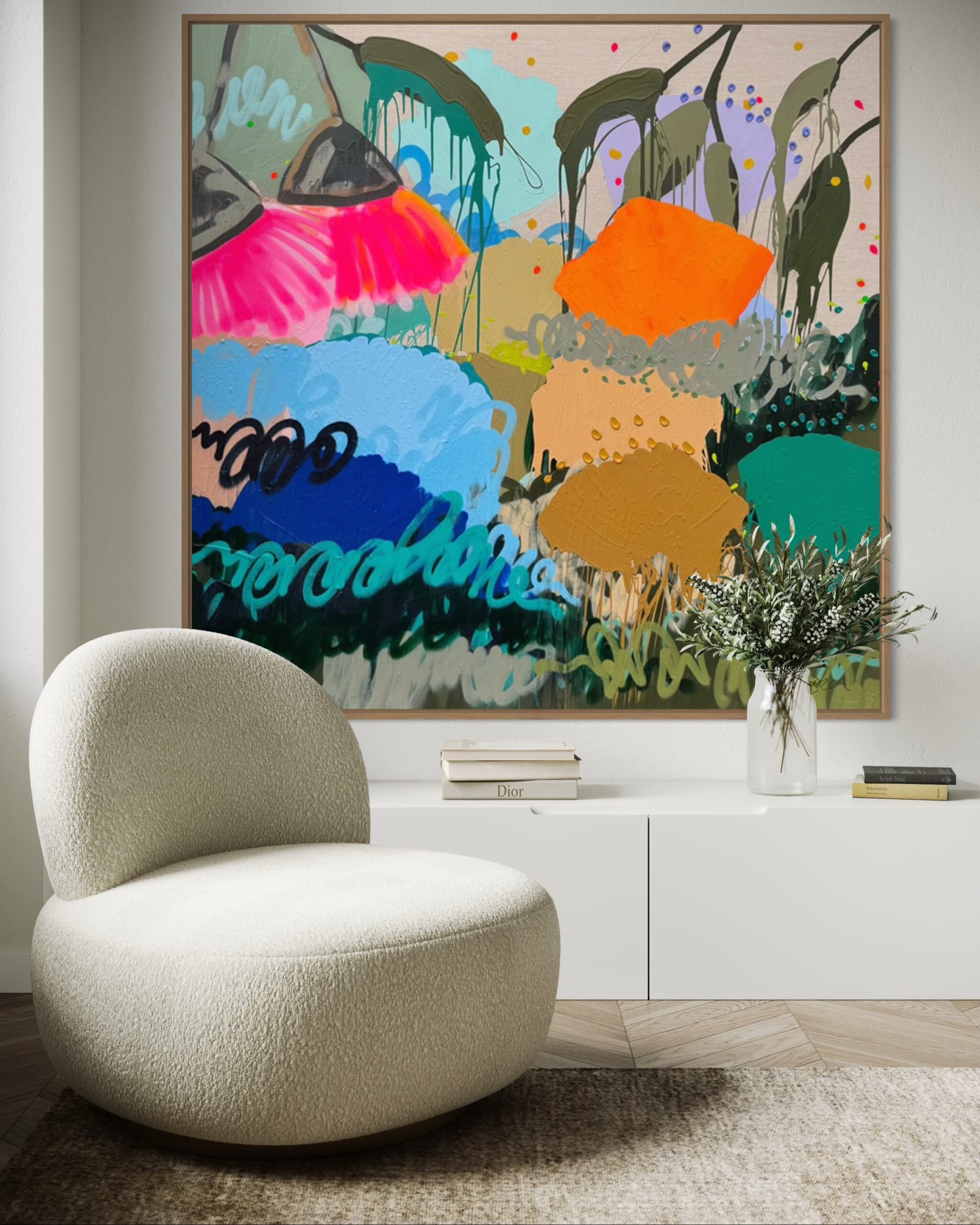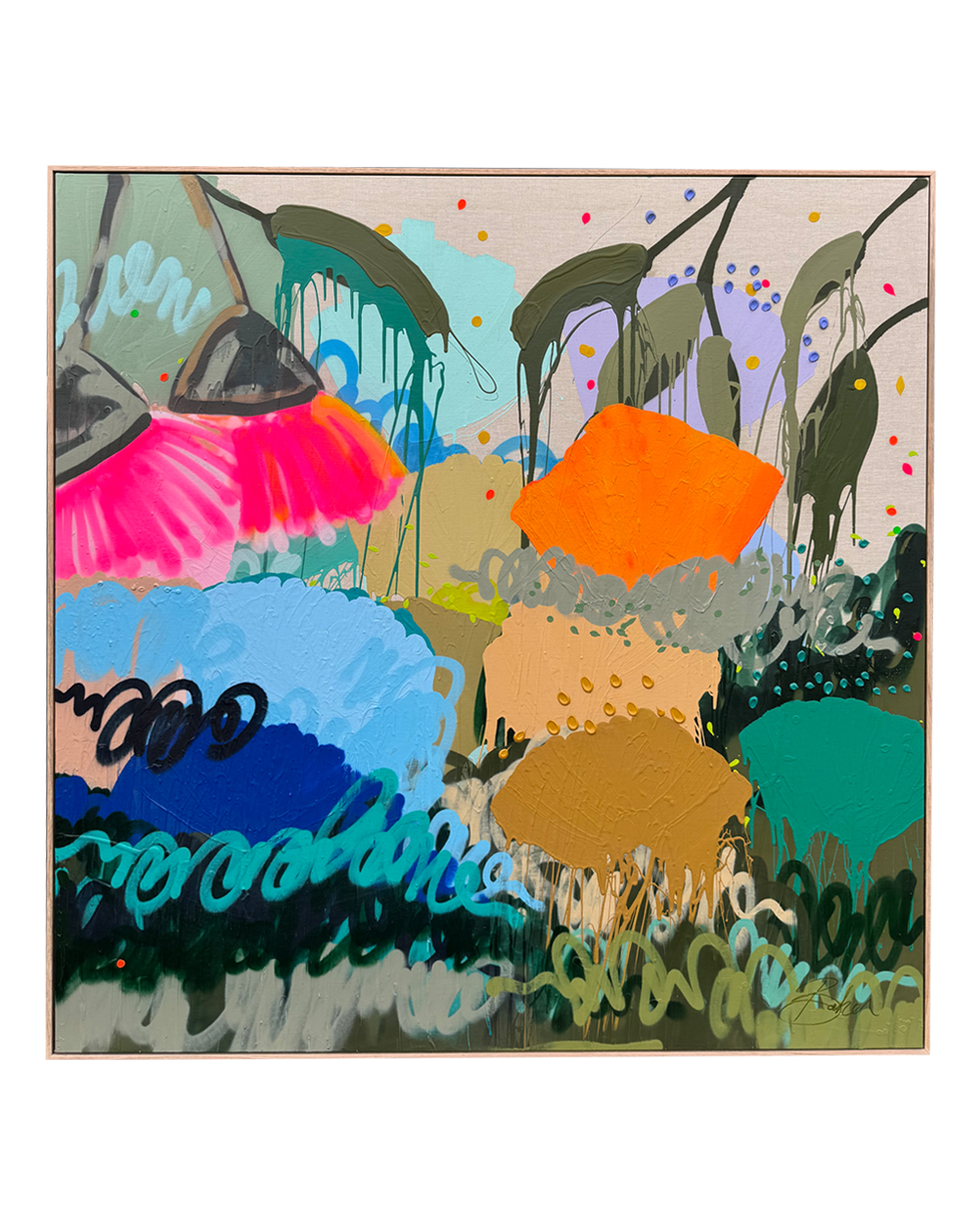 Little Moments radiates with colour and movement. Bright bursts of neon pink and orange sit alongside deep blues, lush greens, and earthy ochres, creating a composition that feels alive and celebratory. Dripping stems, layered brushstrokes, and painterly textures evoke a garden reimagined through a contemporary, street-inspired lens. Every mark carries the artist’s hand, a reminder that Little Moments is unique.