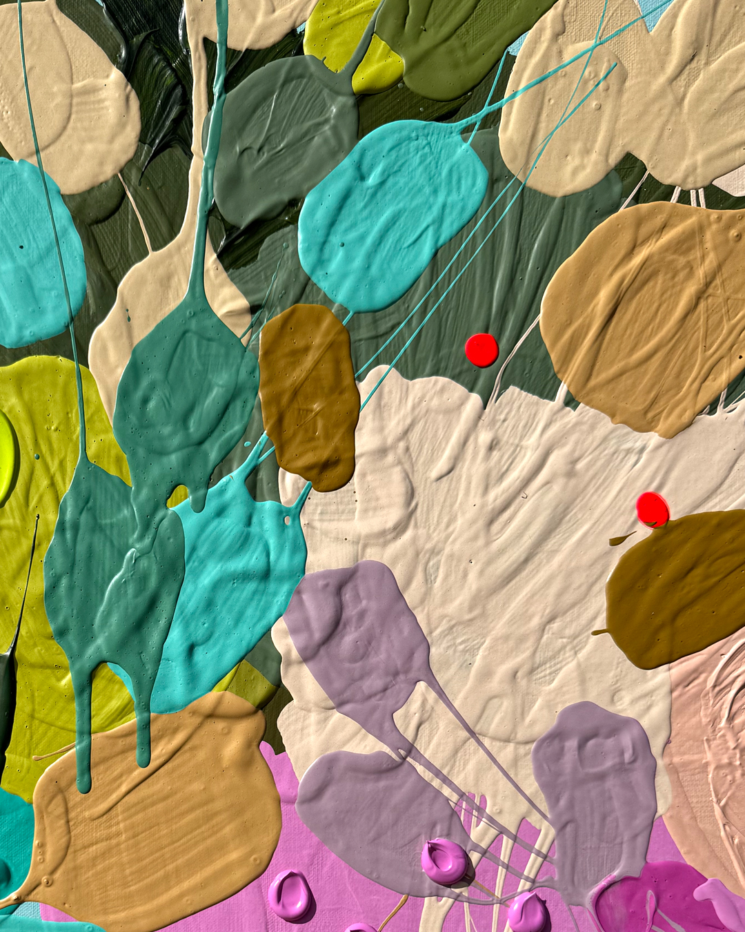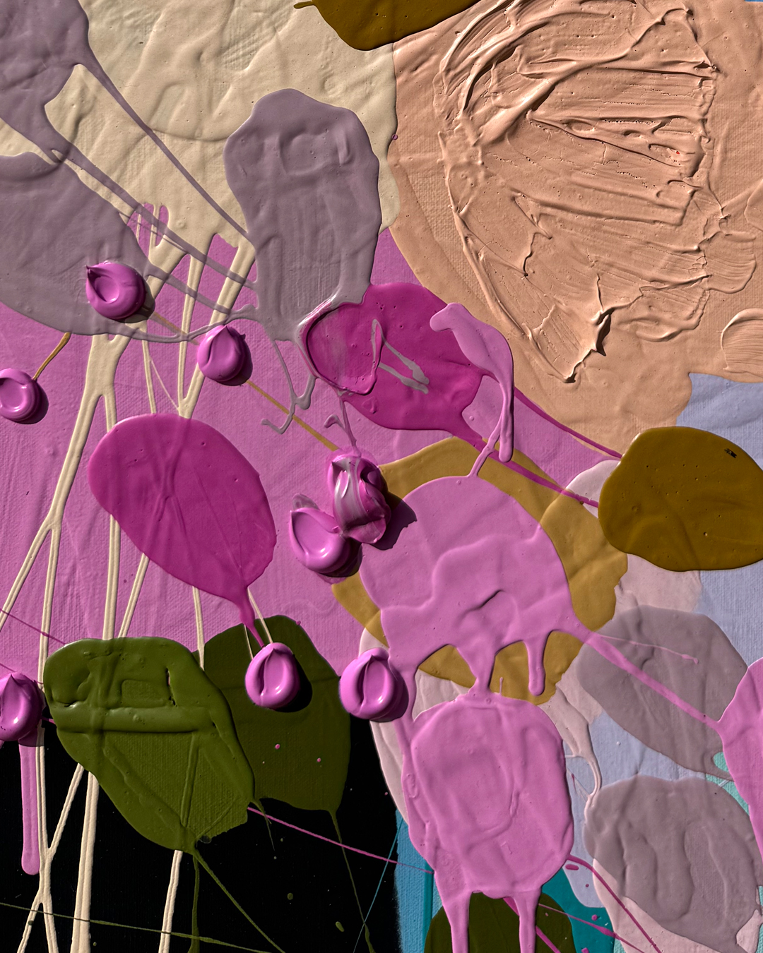 She moved on to her ‘Street Flowers’ collection from the’ Cartel Flowers’ series, still showcasing her signature style and love for colour and texture. ‘Street Flowers’ features a combination of geometric and organic shapes. This range is painted on a square 122 x 122 cm Belgium linen or cotton canvas with a solid-coloured background.
