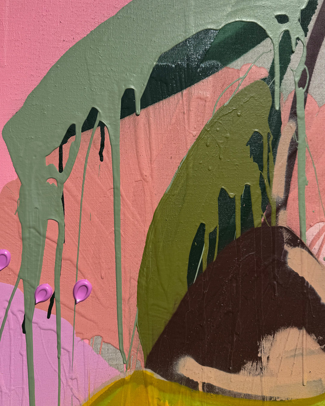 Walk with Flowers bursts alive with painterly textures and radiant hues. Soft blush pinks and warm, earthy tones mingle with striking splashes of chartreuse, orange, and vibrant green. Dripping stems, sweeping marks, and layered blooms bring the canvas to life, creating a wild, expressive garden that feels both untamed and deeply intentional. The artist’s hand is present in every brushstroke, capturing movement and memory as if the flowers themselves are dancing in sunlight.