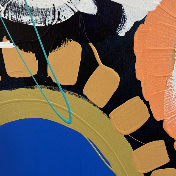 She moved on to her ‘Street Flowers’ collection from the’ Cartel Flowers’ series, still showcasing her signature style and love for colour and texture. ‘Street Flowers’ features a combination of geometric and organic shapes. This range is painted on a square 122 x 122 cm Belgium linen or cotton canvas with a solid-coloured background.