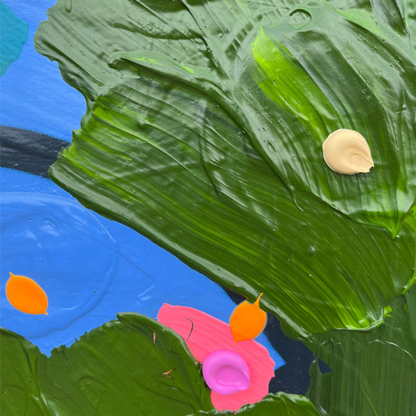Moving on from these early stages, you will now find Jessica painting abstract florals in her studio. For over a decade, she has refined her techniques with a strong emphasis on colour and composition. Through these explorations, she works within three collections: Cartel Flowers, Graffiti Flowers and Street Flowers.